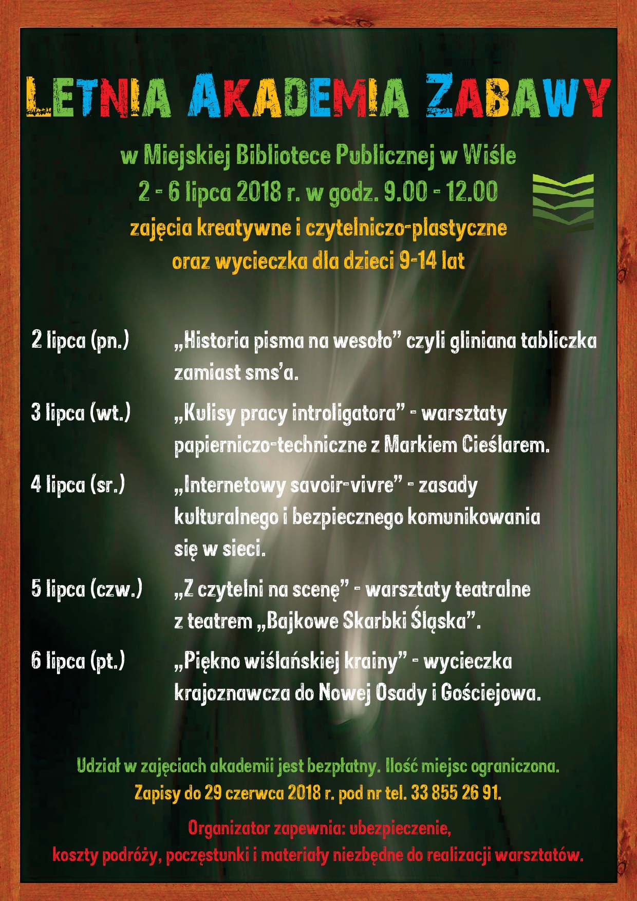 Miejska Biblioteka Publiczna w Wiśle zaprasza dzieci w wieku 9-14 lat do udziału w Letniej Akademii Zabawy. Zajęcia odbywać się będą w dniach 2 - 6 lipca 2018 r., w godz. 9.00 - 12.00.