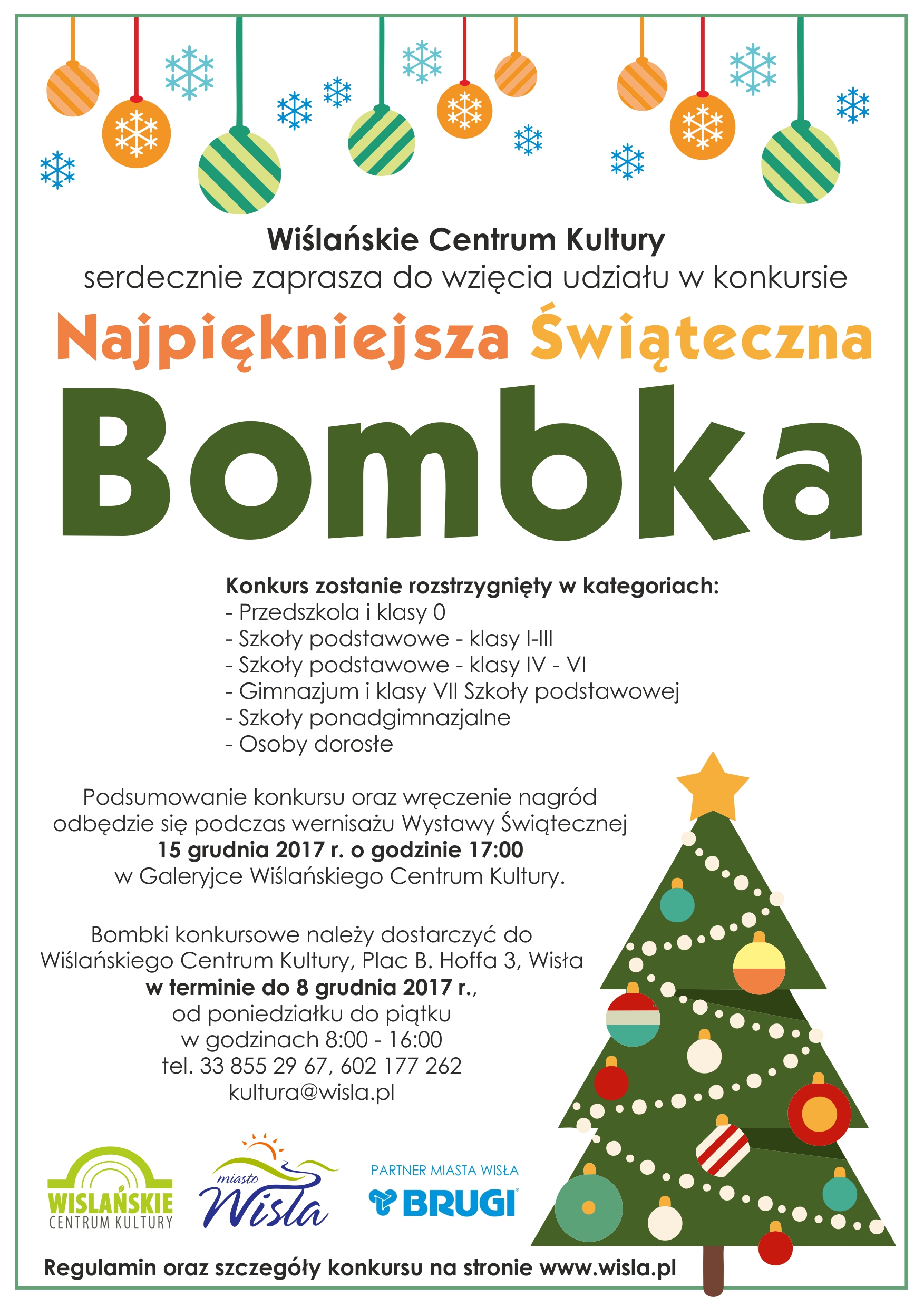 Bombki konkursowe należy dostarczyć do Wiślańskiego Centrum Kultury (Plac B. Hoffa 3, Wisła) w terminie do 8 grudnia 2017 r., od poniedziałku do piątku w godzinach 8:00 - 16:00, tel. 33 855 29 67, 602 177 262, kultura@wisla.pl.
