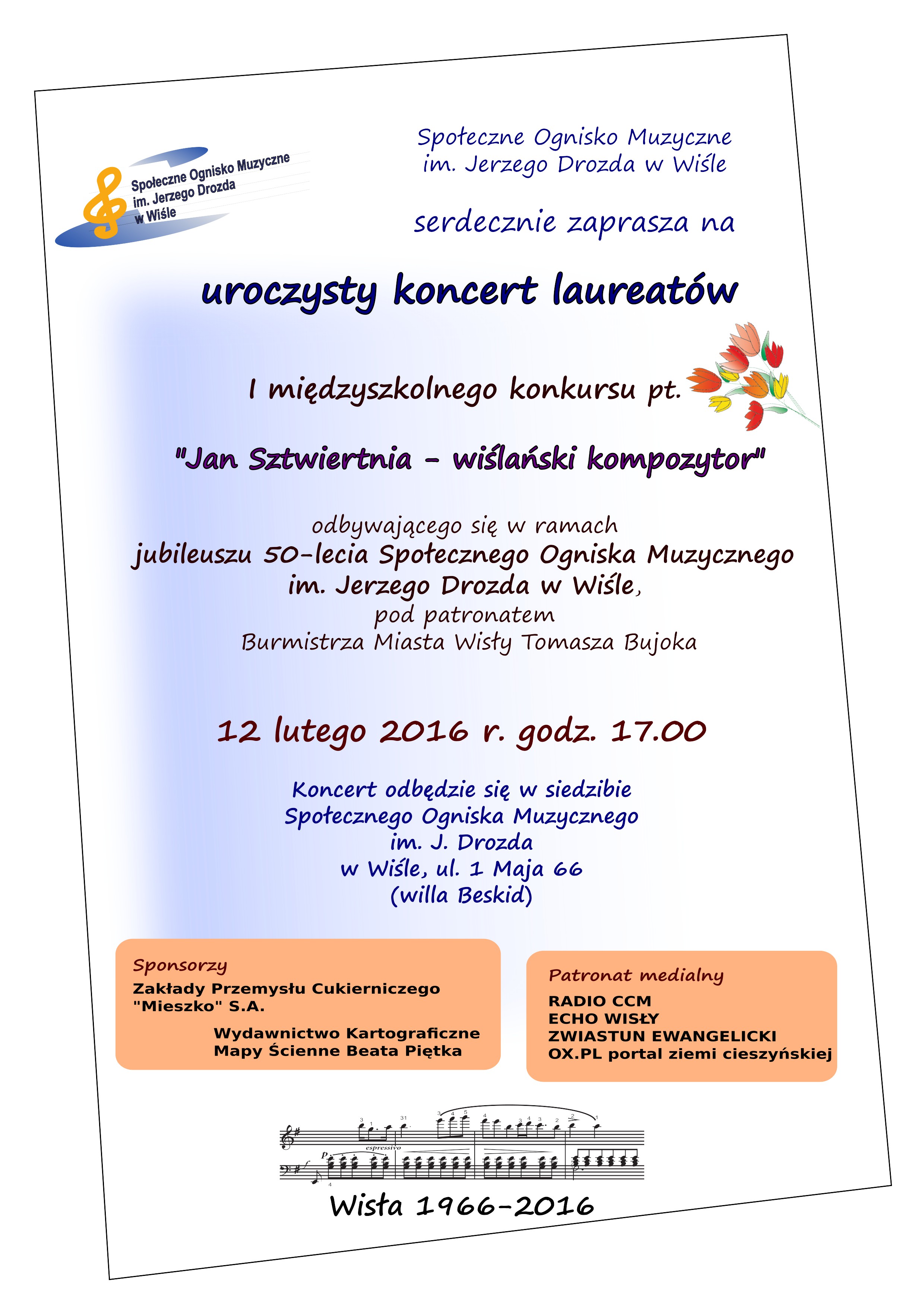 12 lutego zapraszamy na koncert laureatów konkursu "Jan Sztwiertnia - wiślański kompozytor" odbywającego się w ramach jubileuszu 50- lecia Społecznego Ogniska Muzycznego im. Jerzego Drozda w Wiśle pod patronatem Burmistrza Miasta Wisły Tomasza Bujoka
