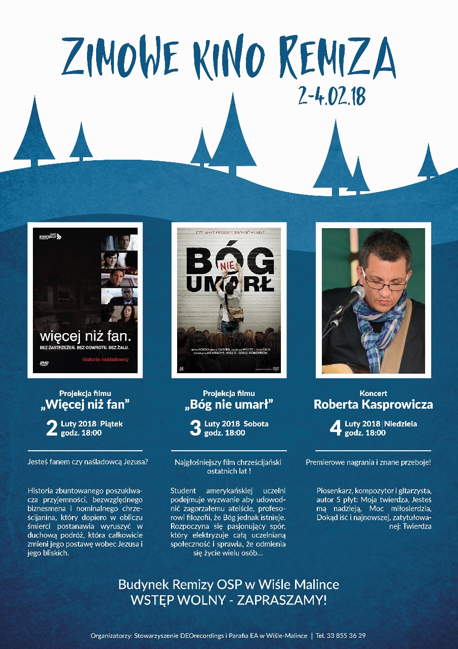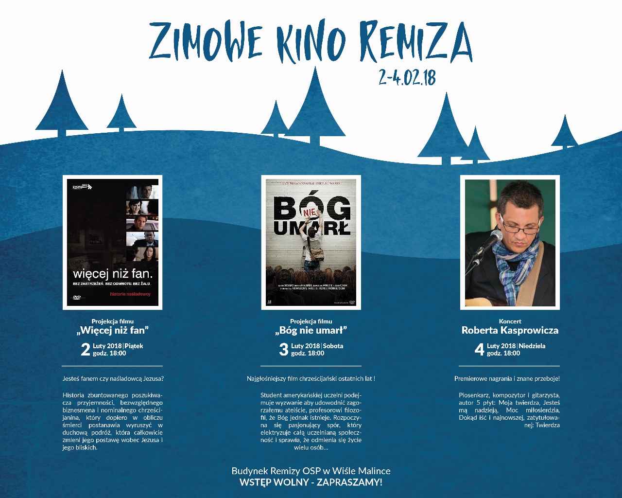 W dniach 2-4 lutego o godz. 18:00, w strażnicy OSP Wisła Malinka zostaną pokazane dwa filmy i odbędzie się jeden koncert: