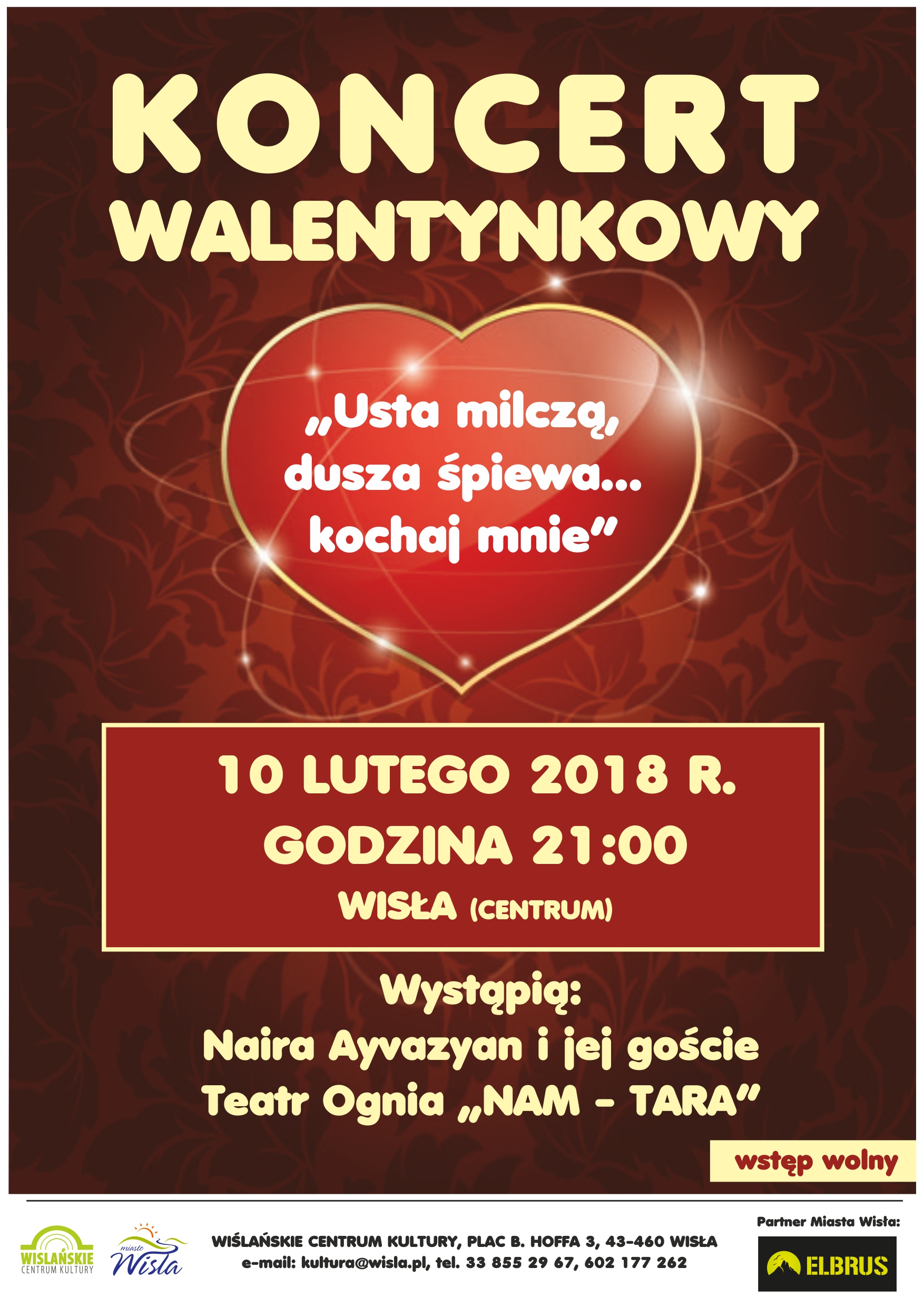 10 lutego o godzinie 21:00 odbędzie się koncert z okazji Walentynek "Usta milczą, dusza śpiewa... kochaj mnie". Wystąpią: Naira Ayvazyan i jej goście oraz Teatr Ognia "NAM - TARA". Koncert odbędzie się w centrum Wisły, na placu przed budynkiem Szkoły Podstawowej nr 1 im. Pawła Stalmacha. Wstęp wolny. Serdecznie zapraszamy.