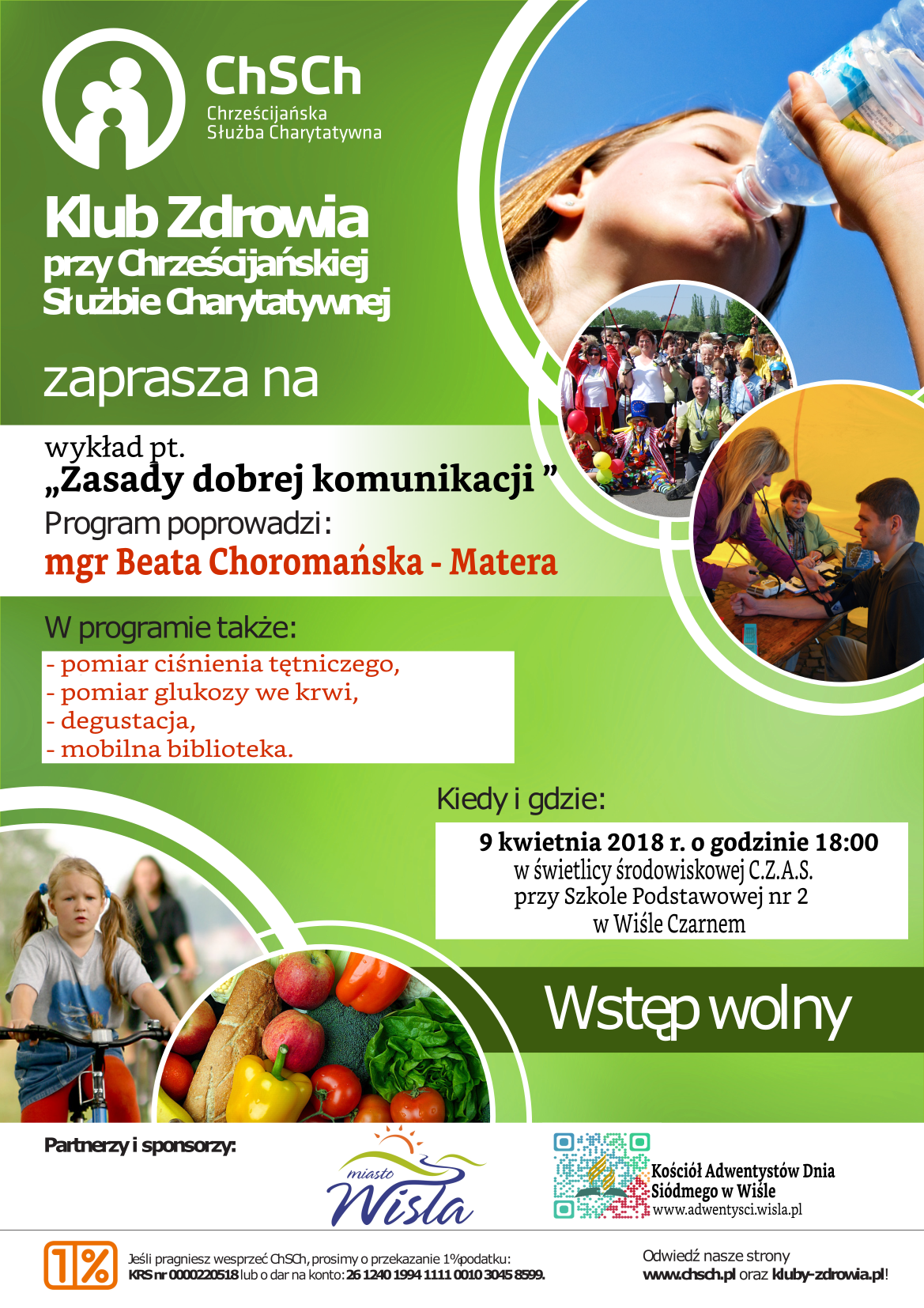 9 kwietnia br. o godz. 18.00 w świetlicy środowiskowej „C.Z.A.S. przy SP-2 w Wiśle Czarnem odbędzie się kolejny wykład na temat zasad dobrej komunikacji. Wykład poprowadzi psycholog-psychoterapeuta mgr Beata Choromańska-Matera. Przed wykładem jak zwykle proponujemy pomiar ciśnienia tętniczego i pomiar poziomu glukozy we krwi. Po wykładzie degustacja zdrowych potraw oraz możliwość skorzystania z biblioteki mobilnej. Uczestnictwo w zajęciach Klubu Zdrowia jest bezpłatne i nie wymaga żadnych deklaracji. Zajęcia odbywają się w każdy pierwszy poniedziałek miesiąca.