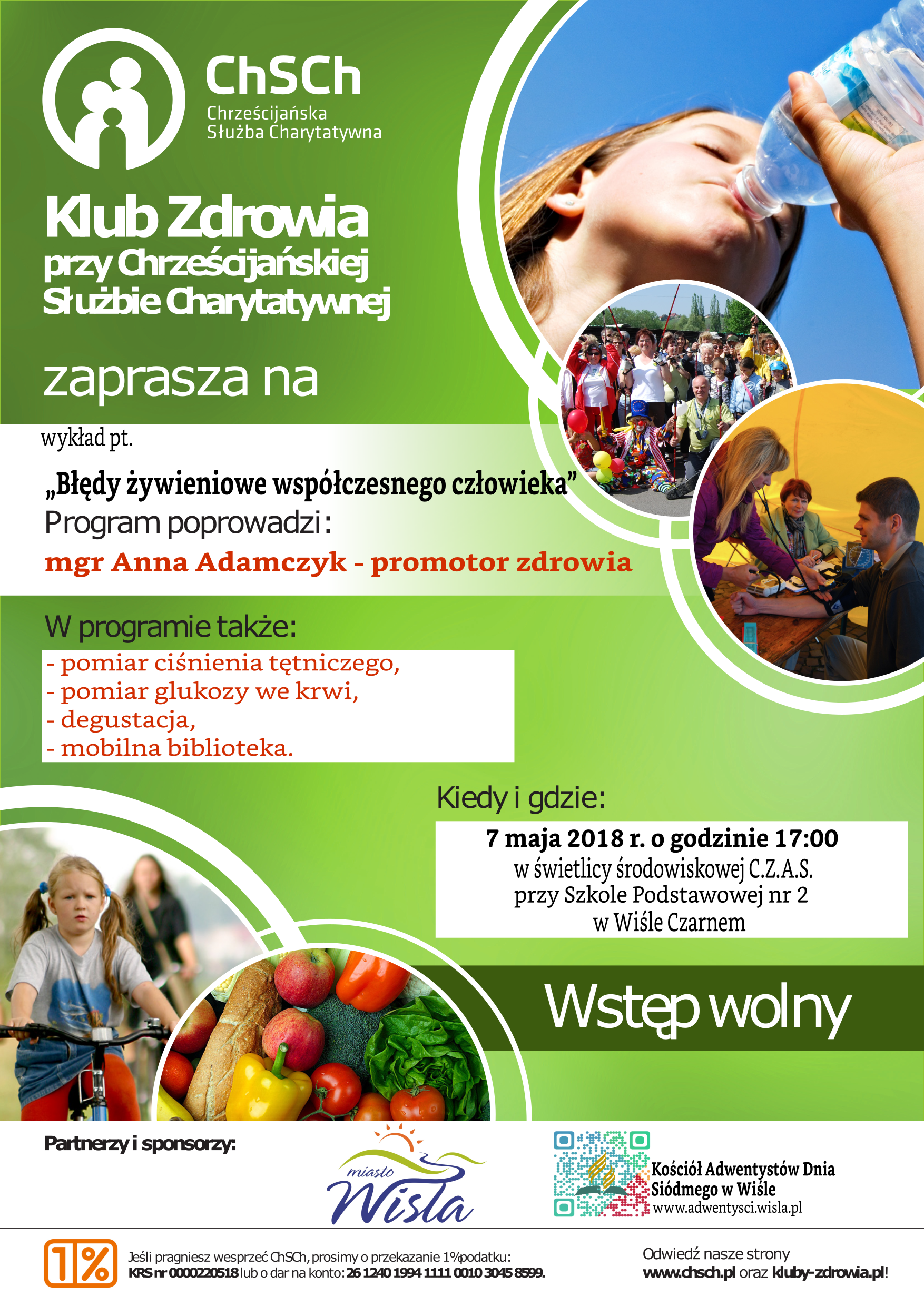 7 maja o godz. 17.00 w świetlicy środowiskowej „C.Z.A.S. przy SP-2 w Wiśle Czarnem odbędzie się kolejny wykład pt. „Błędy żywieniowe współczesnego człowieka”. Wykład poprowadzi Anna Adamczyk - promotor zdrowia. Przed wykładem jak zwykle proponujemy pomiar ciśnienia tętniczego i pomiar poziomu glukozy we krwi. Po wykładzie degustacja zdrowych potraw oraz możliwość skorzystania z biblioteki mobilnej. Uczestnictwo w zajęciach Klubu Zdrowia jest bezpłatne i nie wymaga żadnych deklaracji. Zajęcia odbywają się w każdy pierwszy poniedziałek miesiąca.