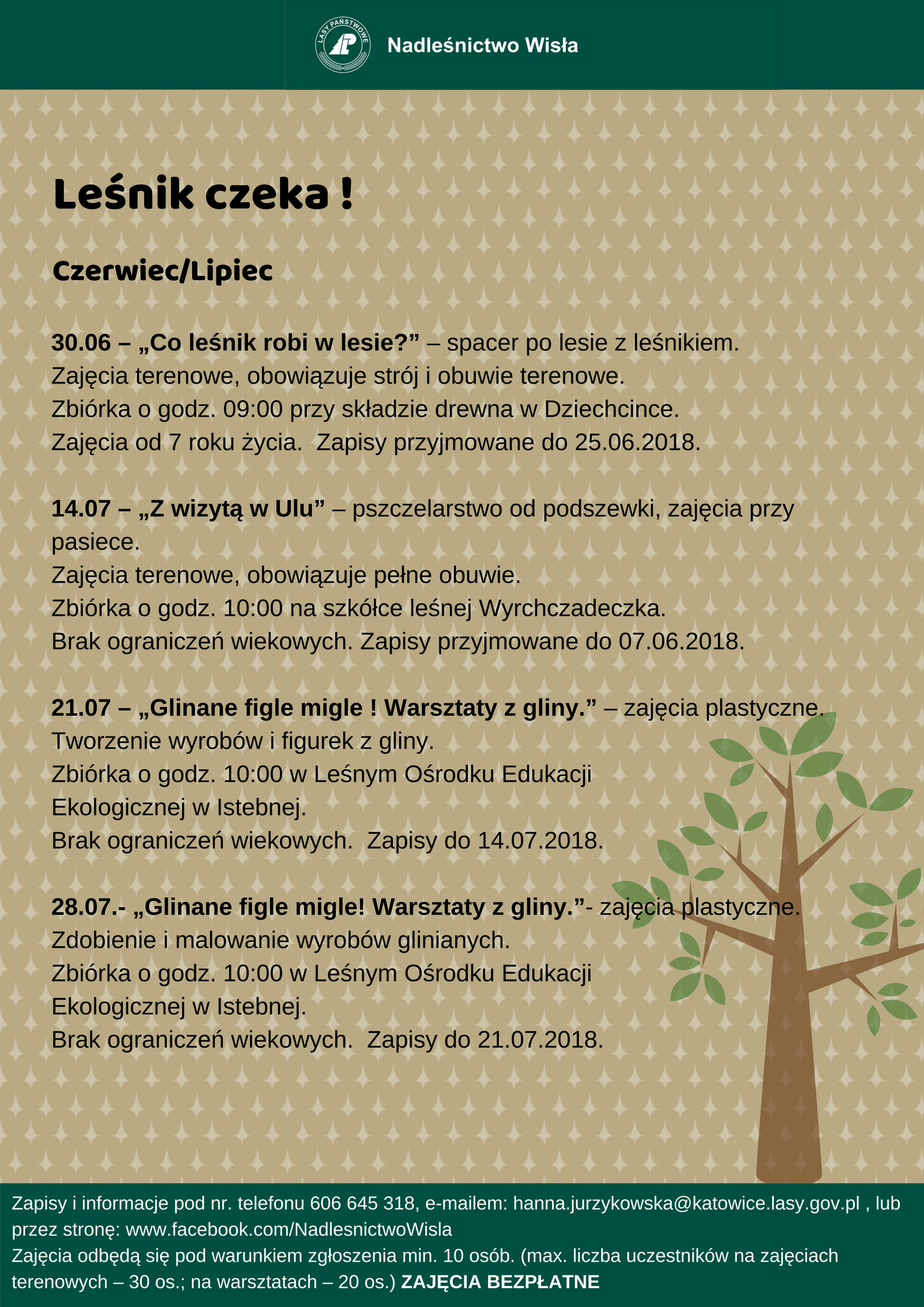 Zapisy i informacje pod nr. telefonu 606 645 318, e-mailem: hanna.jurzykowska@katowice.lasy.gov.pl, lub przez stronę: www.facebook.com/NadlesnictwoWisla
