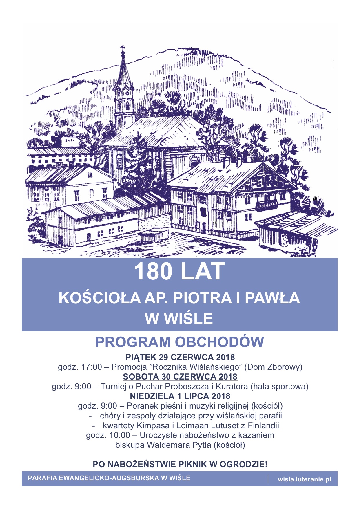 Parafia Ewangelicko-Augsburska w Wiśle zaprasza na nabożeństwo z okazji 180 lat kościoła ap. Piotra i Pawła, które odbędzie się w niedzielę 1 lipca o godz. 10:00. Kazanie wygłosi bp Waldemar Pytel ze Świdnicy.