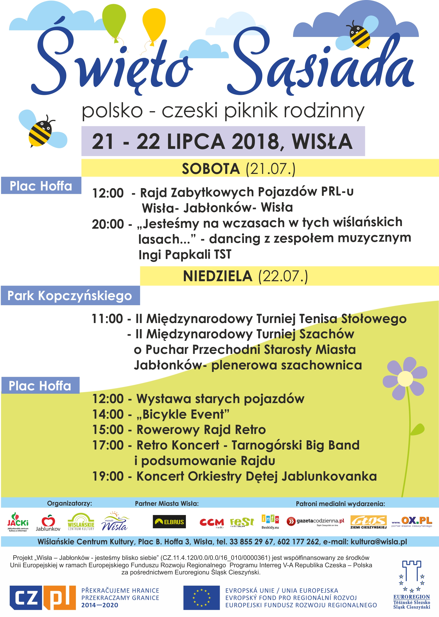 W dniach 21-22 lipca odbędzie się polsko – czeski piknik rodzinny „Święto Sąsiada”. Piknik jest kontynuacją Projektu „Wisła – Jabłonków – jesteśmy blisko siebie”. Wstęp wolny. Serdecznie zapraszamy.