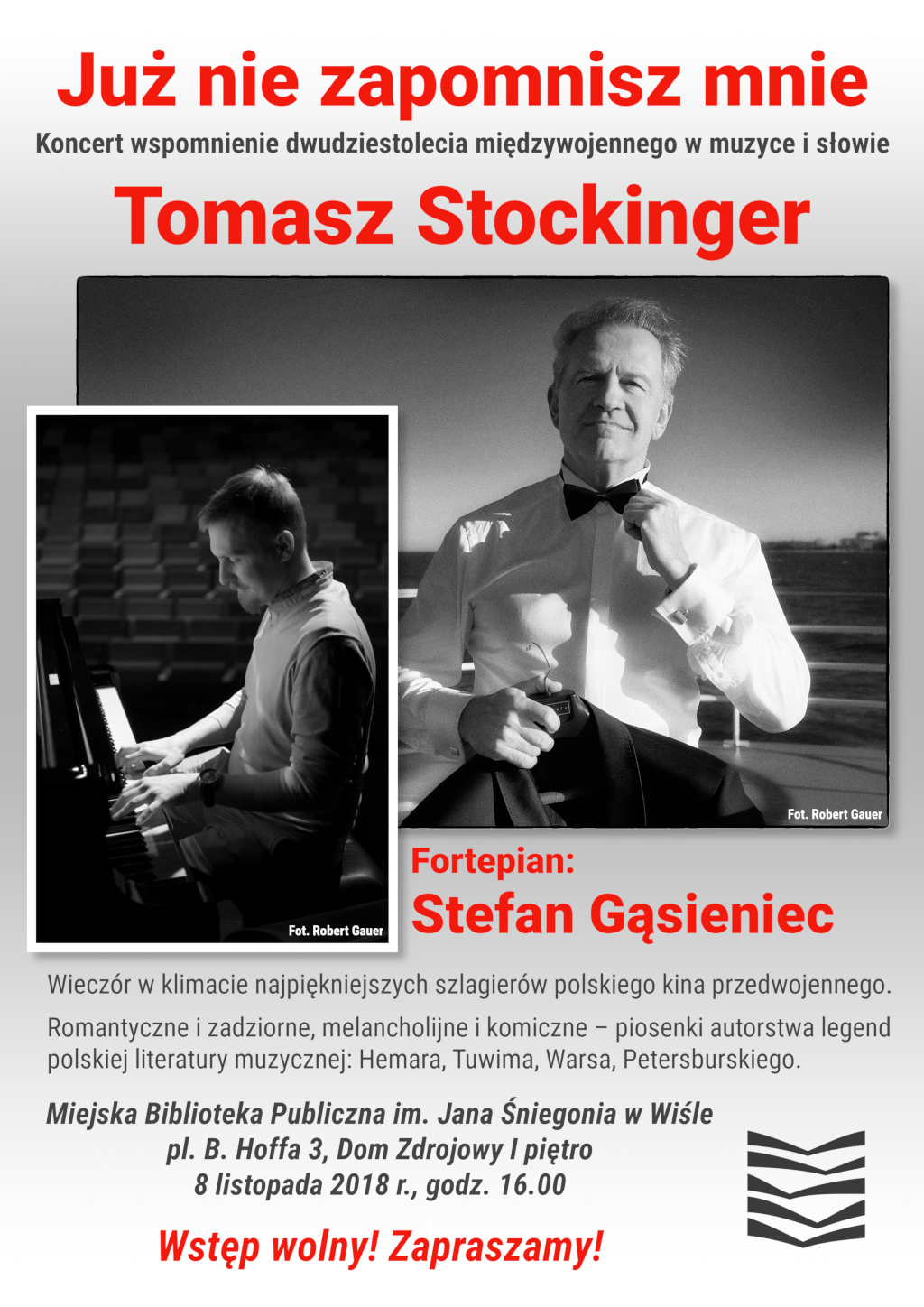 Miejska Biblioteka Publiczna im. Jana Śniegonia w Wiśle serdecznie zaprasza na koncert Tomasza Stockingera „Już nie zapomnisz mnie”. Będzie to wspomnienie dwudziestolecia międzywojennego w muzyce i słowie oraz wieczór w klimacie najpiękniejszych szlagierów polskiego kina przedwojennego. Romantyczne i zadziorne, melancholijne i komiczne – piosenki autorstwa legend polskiej literatury muzycznej: Hemara, Tuwima, Warsa, Petersburskiego.