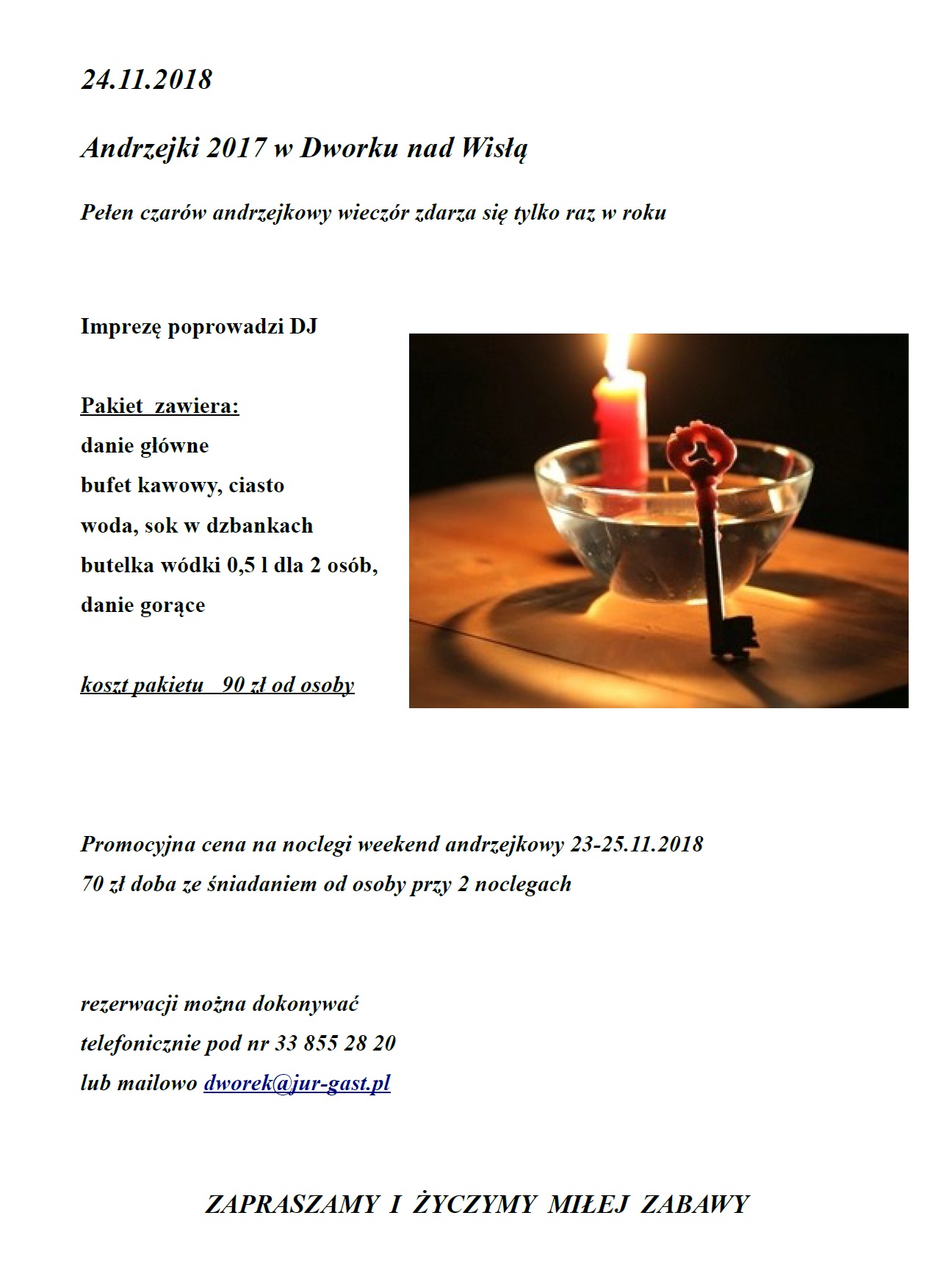 Zapraszamy na zabawę andrzejkową do Dworku nad Wisłą.