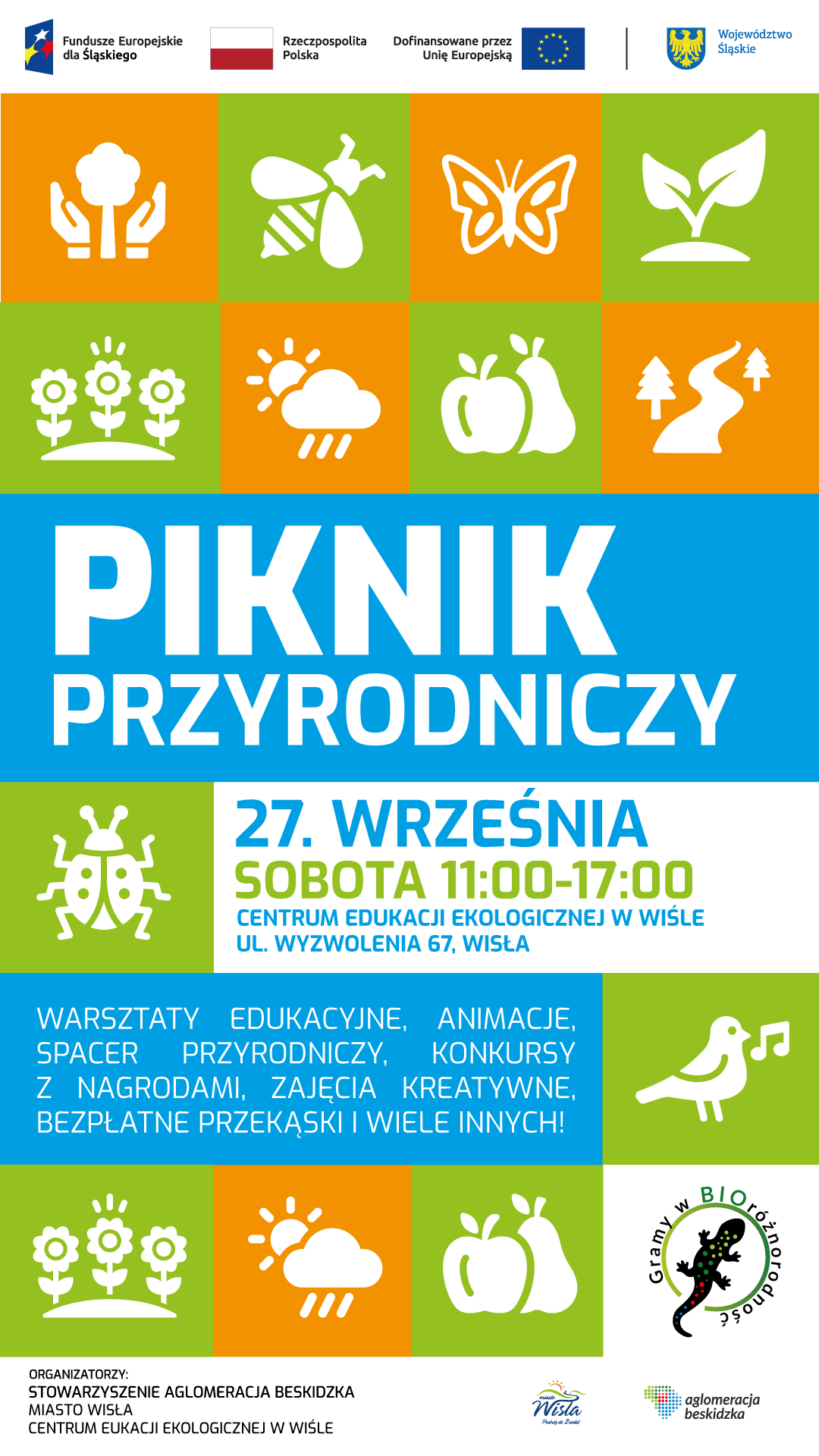 Zapraszamy na przyrodniczy piknik rodzinny w Wiśle organizowany przez Stowarzyszenie AGLOMERACJA BESKIDZKA w ramach realizowanego projektu Ochrona i regeneracja obszarów cennych przyrodniczo wraz z działaniami edukacyjnymi na obszarze Aglomeracji Beskidzkiej - ETAP I. Współorganizatorem pikniku jest Miasto Wisła (Centrum Edukacji Ekologicznej w Wiśle).