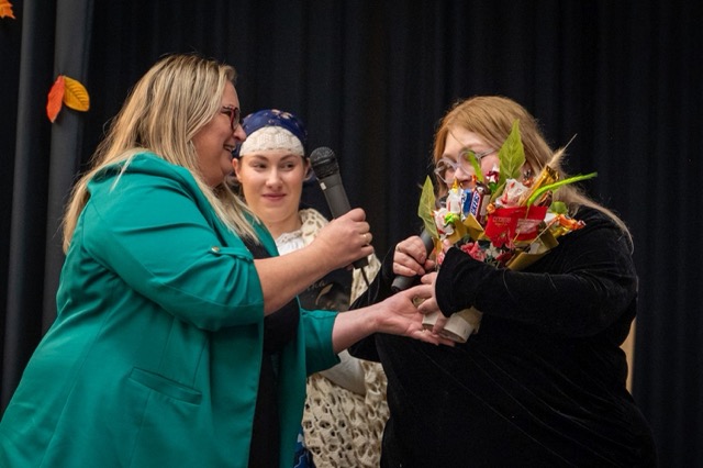 Na zakończenie na salę wjechał okazały tort przygotowany przez Cukiernię „Janeczka”. Symbolicznie pokrojony i podzielony między gości, stał się słodkim zwieńczeniem popołudnia pełnego wzruszeń, wspomnień i dumy z lokalnych tradycji.