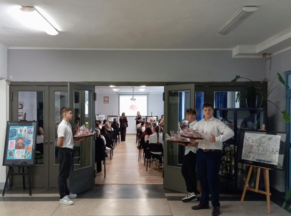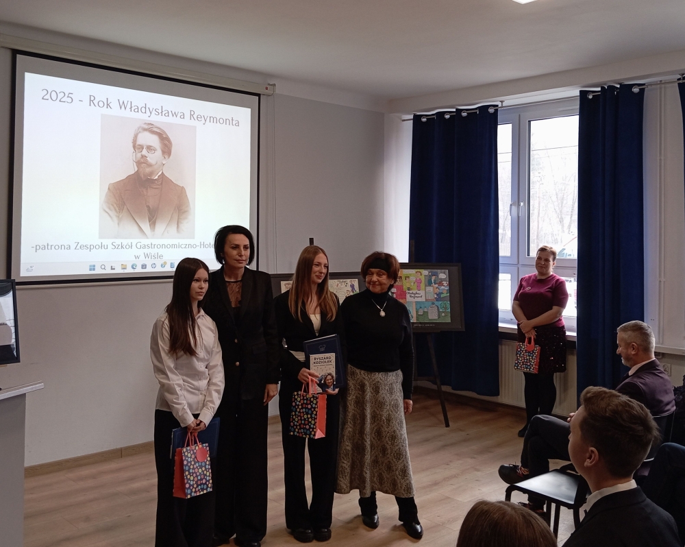w jubileusz 90-lecia Zespołu Szkół Gastronomiczno-Hotelarskich im. Władysława Reymonta w Wiśle – o czym mówiła pani dyrektor Kornelii Zubek, witając szacownych gości: panią Janinę Żagan - Starostę Powiatu Cieszyńskiego, pan Michała Rajwę – Naczelnika Wydziału Edukacji, panią Danutę Łabaj – Przewodniczącą Komisji Edukacji, panią Anetę Legierską-Bujok – Przewodniczącą Komisji Kultury, Sportu i Promocji, panią Katarzynę Czyż-Kaźmierczak - Zastępczynię Burmistrza Miasta Wisła, pana Zdzisława Pilcha – Radnego Miasta Wisła, pana Zbigniewa Wuwera – Prezesa Wiślańskiego Stowarzyszenia Sportowego, pana dr. Sebastiana Chachołka – Dyrektora Muzeum Magicznego Realizmu w Wiśle, panią Annę Łupieżowiec – Dyrektor Wiślańskiego Centrum Kultury wraz z panią Kamillą Księżnik, panem Andrzejem Drobikiem oraz panem Szymonem Pilchem (zaangażowanymi w realizację podcastu „Zupełna cisza - Reymont w Wiśle").