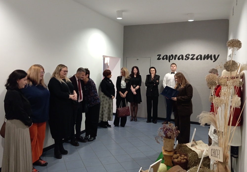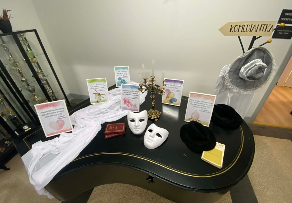 w jakie zostały wpisane ciekawe instalacje, aby niemalże sensualnie wejść w świat powieści Reymonta. Spacer edukacyjny „W świecie powieści Reymonta”, będący pomysłem pani Pauliny Damek- Ryszki, w realizacji którego pomagali nauczyciele ZSGH – szczególnie pani Wioleta Szarzec - z pewnością uatrakcyjnił przestrzenie pięknie zmieniającej się szkoły, ale przede wszystkim przyczynił się do wizualno-symbolicznie-estetycznego odczucia klimatu prozy Reymonta. Pani Paulina Damek-Ryszka wraz z panią dyrektor Kornelią Zubek, gośćmi oraz nauczycielami i uczniami udali się w sensualny świat powieści Reymonta. Pierwszy przystanek – „Komediantka” znajdował się przy fortepianie w holu szkoły. Teatralnie zorganizowana przestrzeń zachęcała do wejścia w świat aktorów, masek i kostiumów. Wszystko to inkrustowane cytatami z utworu Reymonta. Na uwagę zasługują zdjęcia z życia pisarza i przygotowane przez dawnych uczniów ZSGH albumy na temat życia i twórczości pisarza – szczególnie powieści „Chłopi”.