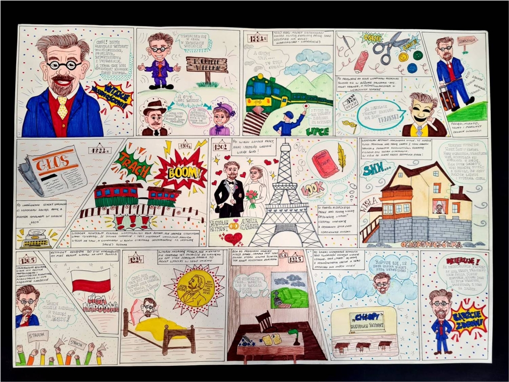 z klasy 4 T. Uczennice w pieczołowity sposób zilustrowały wszystkie najważniejsze momenty z życia pisarza. Wzbogaciły ów biograficzny „świat przerysowany” w bogatą warstwę informacyjną i anegdotyczną. Wszystkie fakty z życia Reymonta od narodzin do śmierci i pomnik pośmiertny autora wnikliwie opowiedziały.